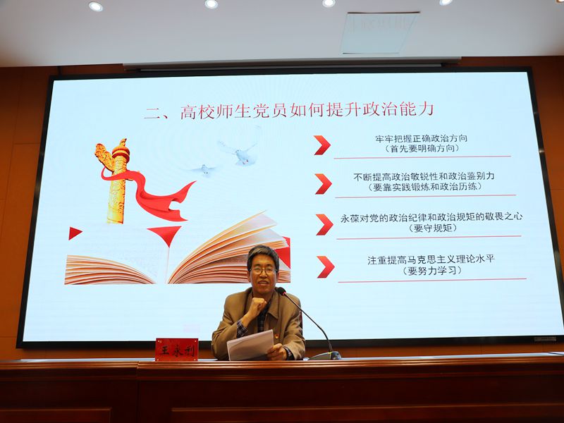 王永利从高校师生党员为什么要提高政治能力以及高校师生党员如何提升政治能力两个方便进行详细论述,他从政党概念、中国共产党的发展历史、抗疫和抗美援朝实践证明以及高校的办学方向和根本任务等方便论述了提高政治能力的重要性。他强调高校师生党员要牢牢把握正确政治方向、不断提高政治敏锐性和政治鉴别力、永葆对党的政治纪律和政治规矩的敬畏之心和注重提高马克思主义理论水平,不断提升政治能力。