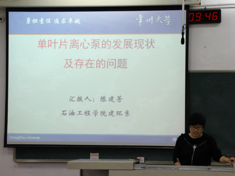 会议伊始,陈建芳老师先向同学们讲述了泵及其应用领域,文字与图片结合使同学们对其有了一个更清晰的了解。随后,陈建芳老师结合自身实践经验和研究成果,理论联系实际,详细地向同学们讲授了单叶片离心泵的结构特点及存在问题、单叶片离心泵的研究现状及其研究方式。并与同学们进行了热烈的交流讨论。