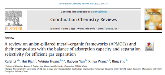 近些年来,关于MOF材料的高质量综述文章不断涌现,但是,迄今为止,全面概述APMOF材料的综述性文章尚未报道。近日,永利集团88304官网集团黄维秋教授团队在国际化学顶级期刊Coordination Chemistry Reviews(中科院分区一区Top期刊,IF=24.8)发表了题为“A review on anion-pillared metal-organic frameworks (APMOFs) and their composites with the balance of adsorption capacity and separation selectivity for efficient gas separation”的长篇综述性文章(篇幅长达43页)。文章首先根据阴离子类型对APMOF材料进行了分类,包括MFSIX (MF62-, M = Metal)、FOXF (MOxF6-x2-)、DICRO (CrO72-)、BSF (B12H122-)、MOFOUR (MO42-)。然后,系统性地总结了APMOF及其复合材料在气体分离方面的研究进展,如CO2分离、C2H4纯化、C3H6纯化、C4异构体分离、C5异构体分离、二甲苯异构体(pX/mX/oX)分离和Xe/Kr分离。最后,提出了未来APMOF材料的研究趋势。