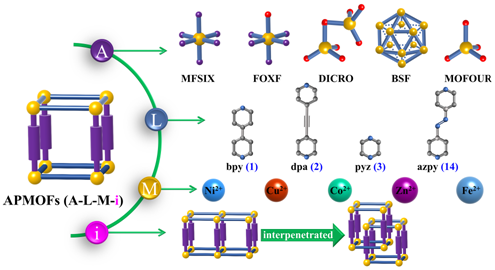 气体混合物的高效精细化分离是世界石油化工生产的关键技术及研究热点,其中CO2分离、CH4分离、烯/炔/烷烃分离、同分异构体(C4-C8)分离,Xe/Kr分离等是现代化工过程中高质量生产的难点和新挑战。传统的热驱动分离(如精馏分离和催化加氢分离)存在能耗高等缺陷,而采用非热驱动分离(如吸附分离和膜分离)不仅可以降低能耗,且分离效果显著。在吸附分离过程中,金属有机骨架(Metal-Organic Framework,MOF)材料因其多样的孔尺寸/形状以及易官能化等特点,为吸附分离技术提供了可靠的解决方案,但通常存在吸附容量和分离选择性难以兼具的现象(称为trade-off效应)。作为MOF材料的一个重要分支,阴离子柱撑MOF材料(Anion-Pillared MOF,APMOF)不仅具有优异的孔结构特性,而且其孔道内的强碱性无机阴离子位点(F、O、H等)为气体分子提供了丰富的氢键受体,形成了协同的主-客和客-客相互作用力,从而实现了气体混合物的高效分离。