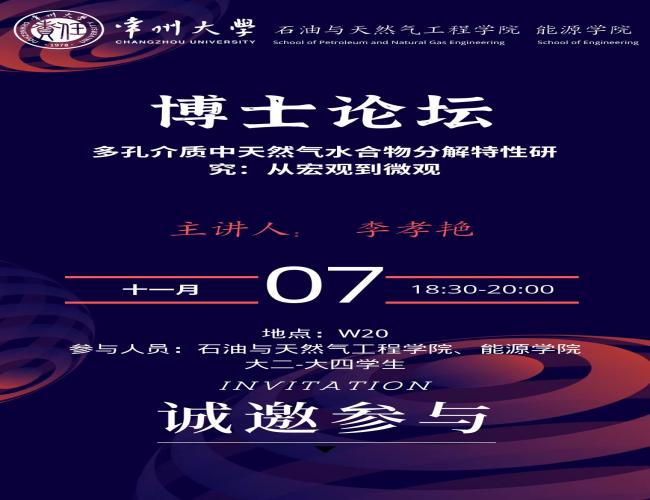 二、汇报内容:2020年3月,我国成功完成南海天然气水合物(可燃冰)第二次试采,完成了从“探索性试采”向“试验性试采”的跨越。天然气水合物是一种能量密度高、燃烧无污染的非常规化石能源,广泛分布在海底大陆架及极地永冻层中,全世界天然气水合物储量高达10^18 m3,是一种极具潜力的新能源。如何高效开采天然气水合物是目前面临的主要难题,报告以天然气水合物高效开发为目的,从宏观到微观,从数值模拟到实验研究,逐层次阐述了多孔介质沉积层中天然气水合物的分解特性,分析了不同尺度下影响多孔介质中天然气水合物分解速率的关键性因素,明确了天然气水合物的优化开采方法。研究工作可为我国天然气水合物的高效开发、产气速率的优化提升提供理论依据与数据支持,加快天然气水合物商业开采步伐。