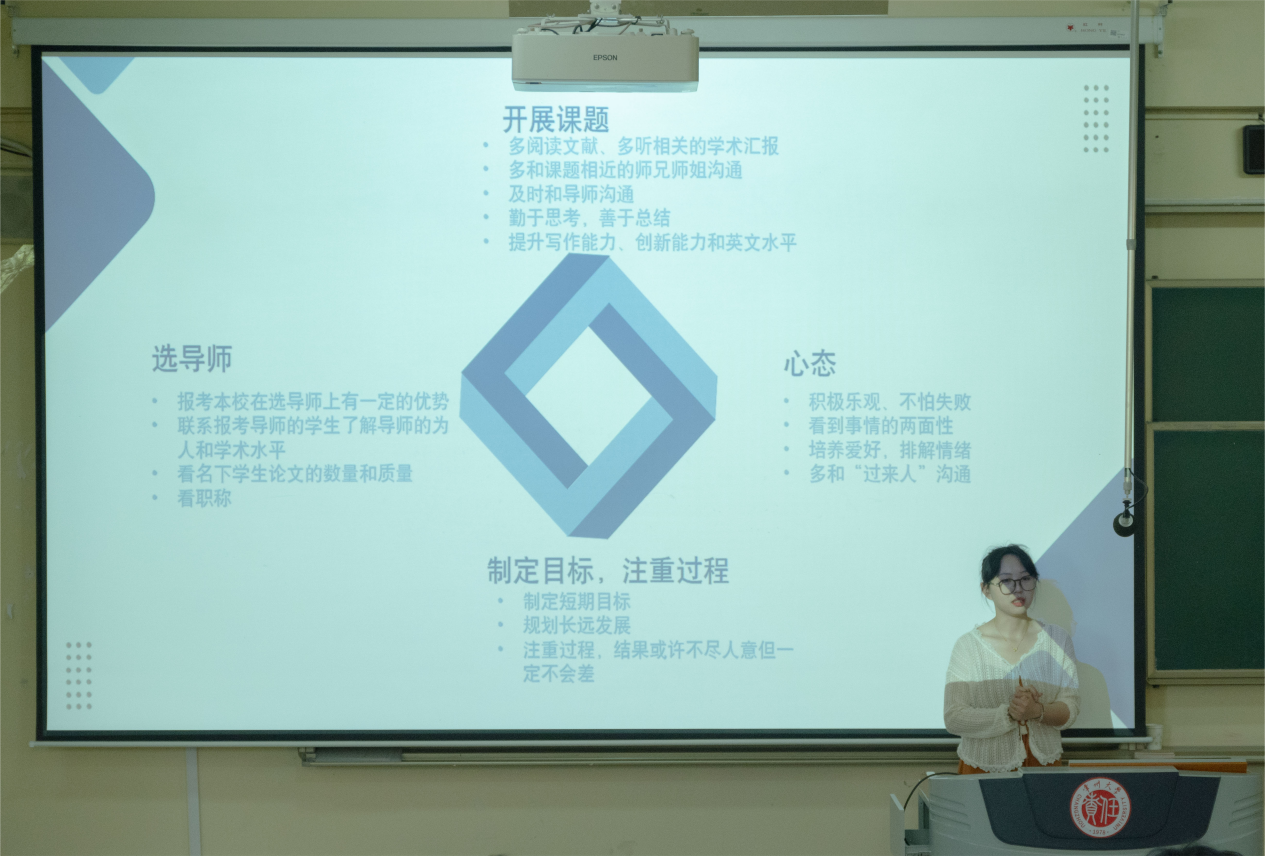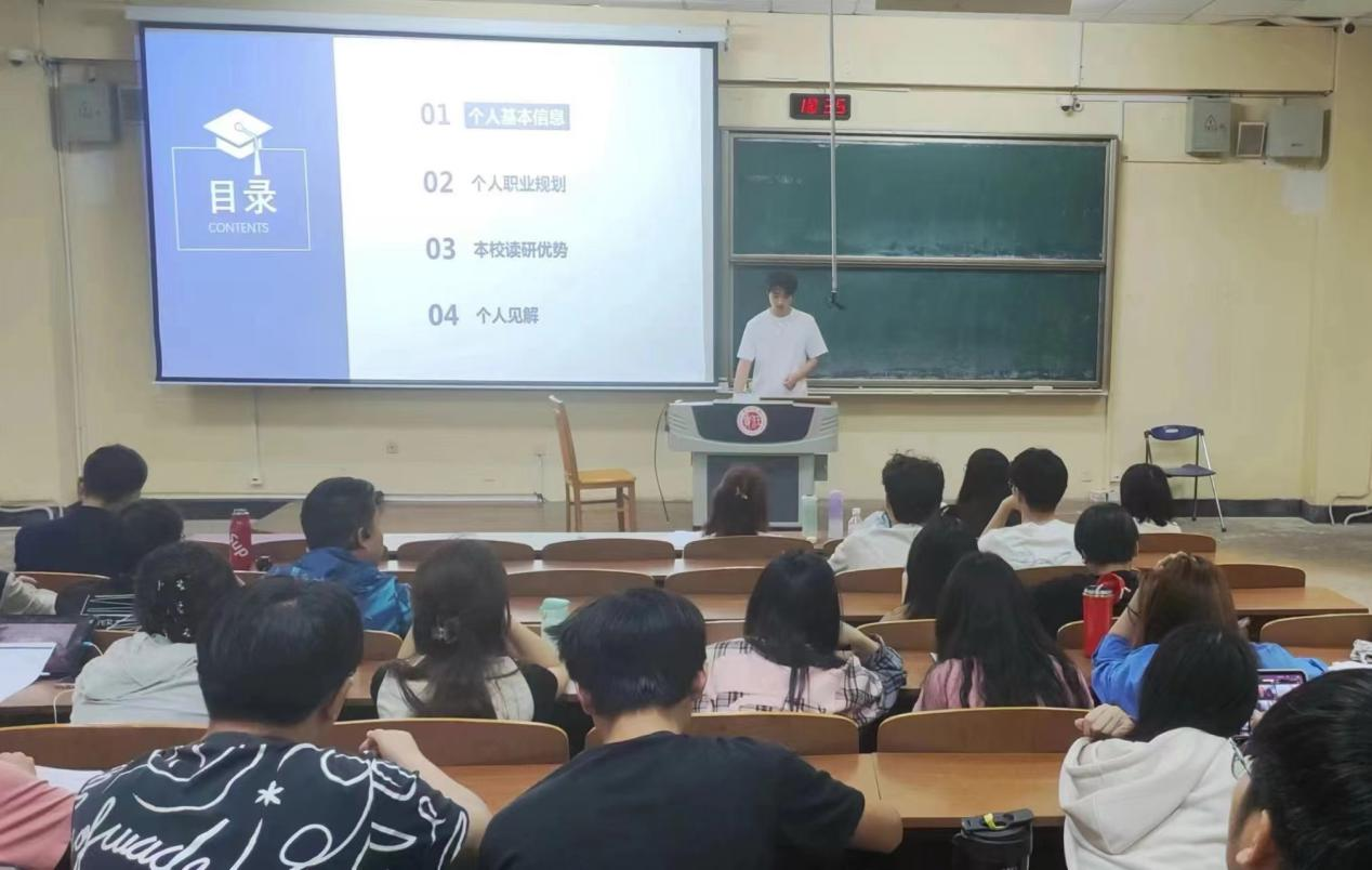 分享会上,胡子伟从基本信息、职业规划、本校读研的优势以及个人见解四个方面出发,为即将步入社会的本科生们提供了宝贵的经验和启示。他详细阐述了自己的职业规划并且给出了建议。他强调,成功并不是一蹴而就的,需要付出艰辛的努力和坚持。他鼓励同学们要勇于面对挑战和困难,保持积极向上的心态和乐观的精神状态,同时也提醒大家要注重个人修养和素质的提升,做一个有道德、有责任感的人。