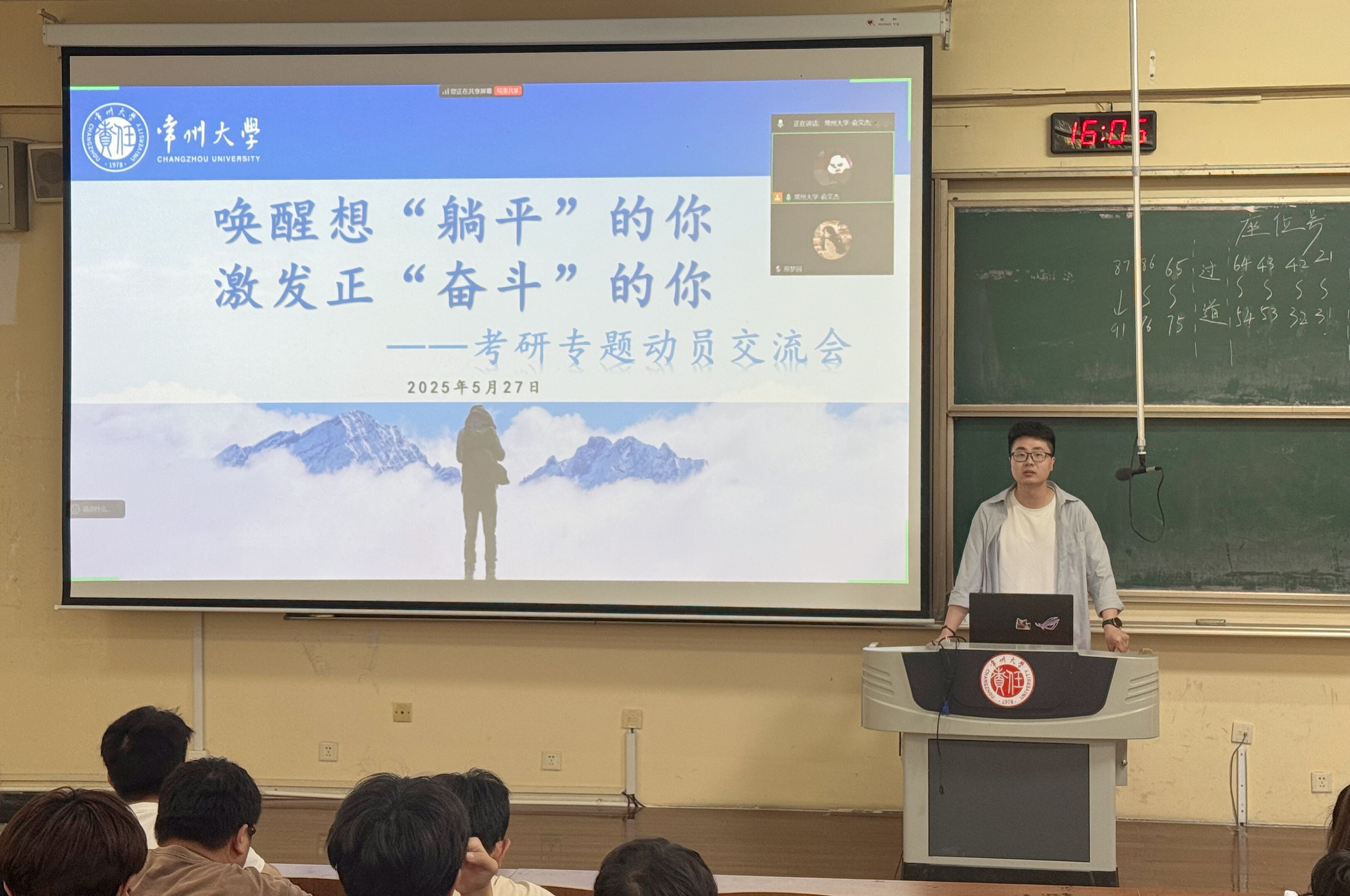 为进一步加强学风建设,帮助学生深入了解研究生招生考试政策,全面调动2023级学生的考研积极性,明确考研目标、增强考研信心。5月27日,永利官网在W1、W2阶梯教室召开2023级年级大会暨考研动员会,会议由年级辅导员张健主持,2023级全体同学参会。