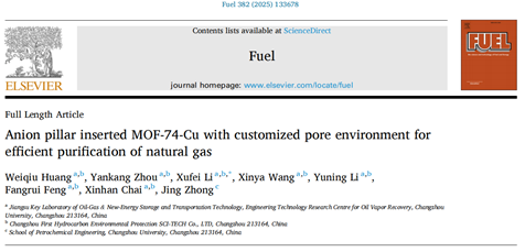 近日,黄维秋教授团队在国际顶级期刊《Fuel》上发表了题为“Anion pillar inserted MOF-74-Cu with customized pore environment for efficient purification of natural gas”的研究论文,报道了一种利用功能化阴离子柱修饰MOF材料的合成策略,实现了天然气中酸气和低碳烷烃的高效分离。