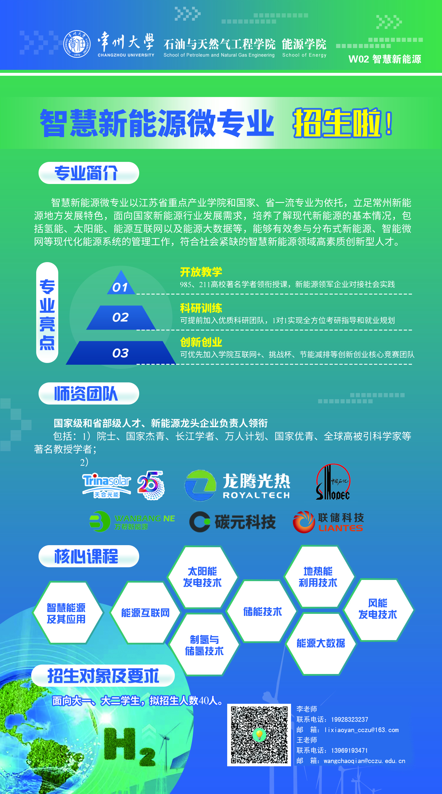 智慧新能源微专业 招生简章 专业简介:智慧新能源微专业以江苏省重点产业学院和国家、省一流专业为依托,立足常州新能源地方发展特色,面向国家新能源行业发展需求,培养了解现代新能源的基本情况,包括氢能、太阳能、能源互联网以及能源大数据等,能够有效参与分布式新能源、智能微网等现代化能源系统的管理工作,符合社会紧缺的智慧新能源领域高素质创新型人才。