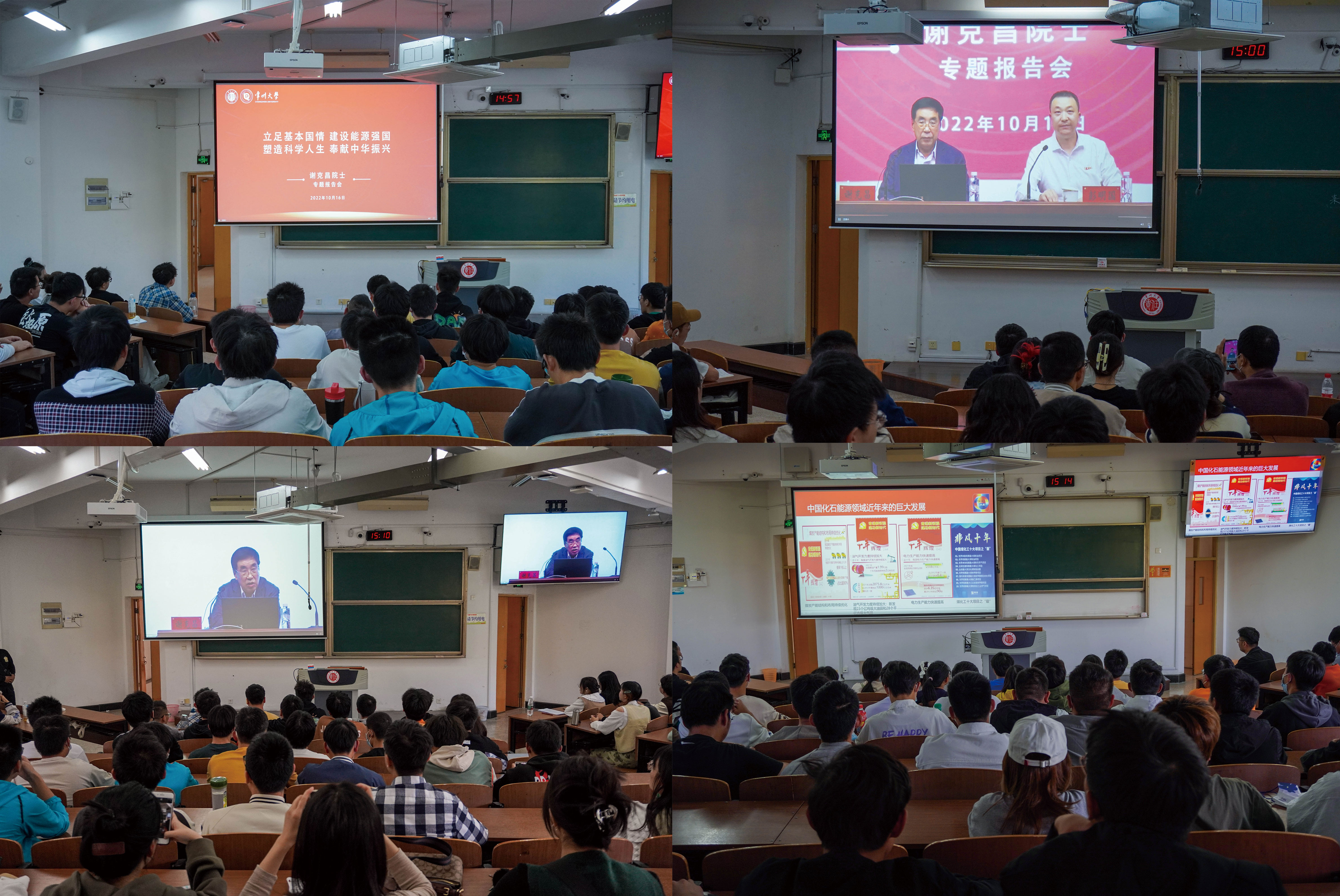 10月16日下午,在党的二十大胜利召开之际,为深入学习贯彻党的二十大精神,服务好国家能源战略需求,培养出特色鲜明的能源行业拔尖创新人才。中国工程院院士、永利集团88304官网集团城乡矿山研究院驻站院士谢克昌教授受邀为永利集团88304官网集团师生讲授公开课。活动在科教城校区文彰楼报告厅设置主会场,在W15阶、W16阶、W17阶和W18阶等4个教室设置分会场,同时以视频直播方式同步举行。永利集团88304官网集团、能源学院全体师生、城乡矿山研究院部分教师代表等以线下线上形式参与此次活动。活动由永利集团88304官网集团、能源学院院长彭明国主持。